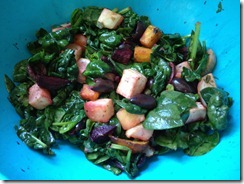 4. After beets/turnips are finished roasting, remove from oven and carefully scoop into bowl with spinach mixture. Toss salad gently until spinach leaves begin to wilt and ingredients are evenly incorporated. (After leaves don’t wilt as much as you’d like, simply microwave salad 20-30 seconds).